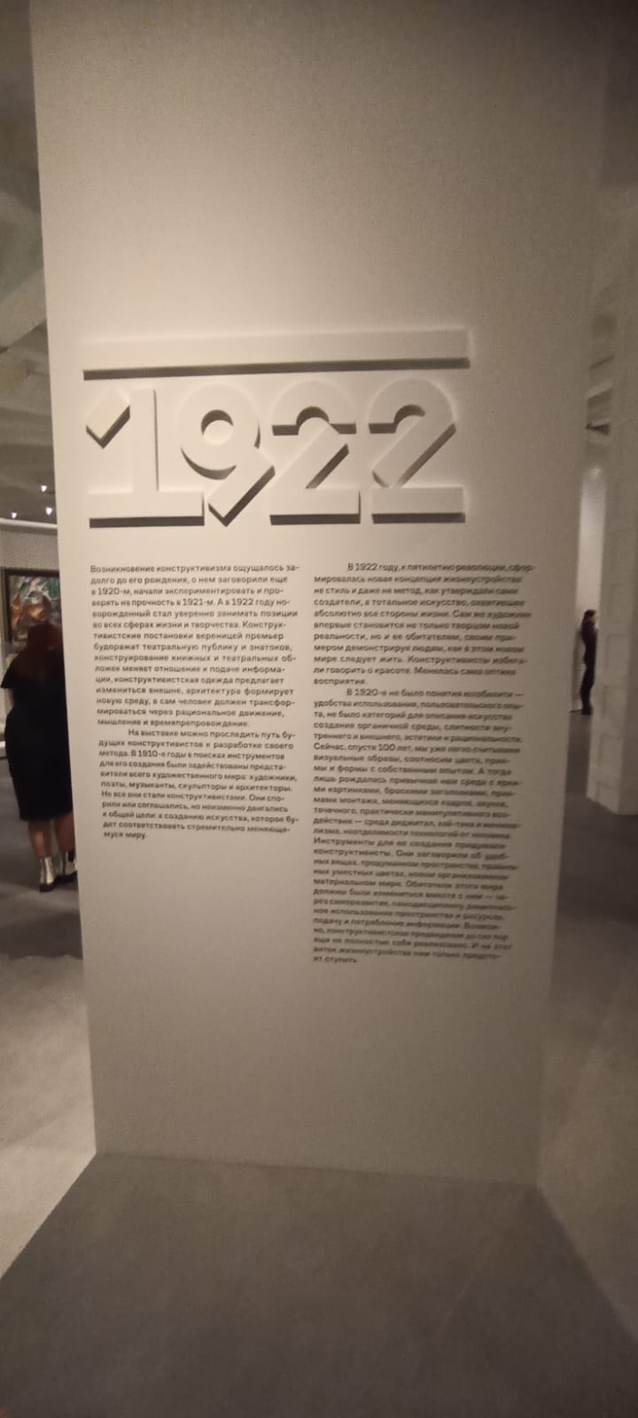 Несколько слов о самой выставке: Выставка «1922. Конструктивизм. Начало» рассказывает о рождении художественного явления, изменившего искусство ХХ века. Создатели говорили о конструктивизме как об «универсальном методе» построения материальной среды. В нем сочетались эстетические достоинства и продуманный функционал. Слово «конструктивизм» стало брендом, с которым ассоциируют советское авангардное искусство 1920-х. Прославили его архитекторы, а зачинали художники и поэты.